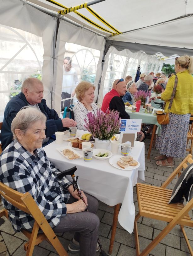 Zdjęcie przedstawia spokojną, towarzyską scenę na świeżym powietrzu, prawdopodobnie w parku lub ogrodzie. Grupa starszych osób, z których wiele siedzi na wózkach inwalidzkich lub ławkach, uczestniczy w spotkaniu. Wygląda na to, że rozmawiają ze sobą i delektują się napojami lub przekąskami. Nad nimi rozpostarty jest duży zielony parasol, który daje cień. Do parasola i innych elementów otoczenia przyczepione są kolorowe balony, co nadaje wydarzeniu świąteczny, radosny charakter