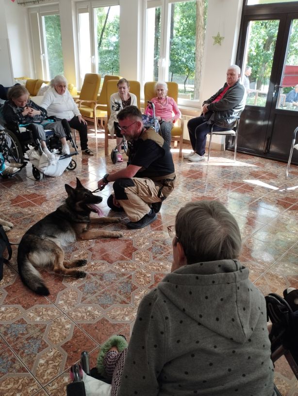 Na zdjęciu widać grupę osób w pomieszczeniu. Jedna z nich, ubrana w szary żakiet i fioletowe spodnie, siedzi na krześle i głaszcze czarnego psa. W tle znajdują się inne osoby, z których część siedzi na wózkach inwalidzkich. W pomieszczeniu są także meble – stoły i krzesła. Podłoga jest wyłożona kafelkami z geometrycznym wzorem.