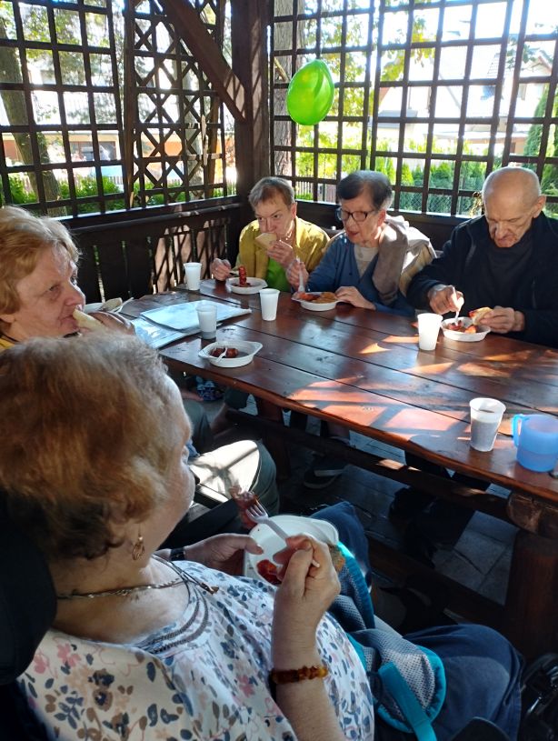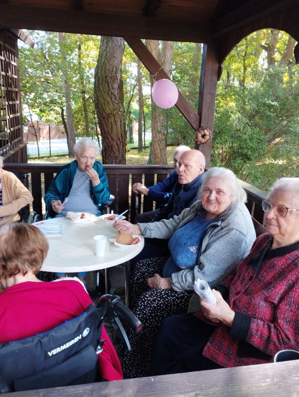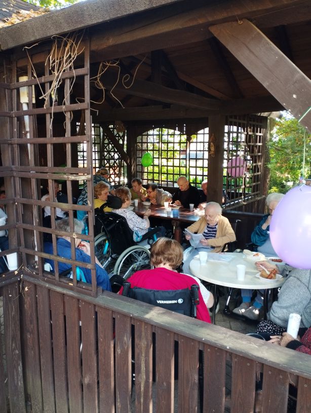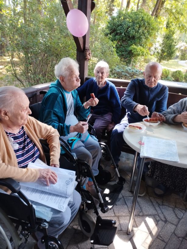 Zdjęcie przedstawia spokojną, towarzyską scenę na świeżym powietrzu, prawdopodobnie w parku lub ogrodzie. Grupa starszych osób, z których wiele siedzi na wózkach inwalidzkich lub ławkach, uczestniczy w spotkaniu. Wygląda na to, że rozmawiają ze sobą i delektują się napojami lub przekąskami. Nad nimi rozpostarty jest duży zielony parasol, który daje cień. Do parasola i innych elementów otoczenia przyczepione są kolorowe balony, co nadaje wydarzeniu świąteczny, radosny charakter. W tle widać wysokie drzewa i dużo zieleni, co sugeruje, że pogoda jest przyjemna, a miejsce spokojne i naturalne.