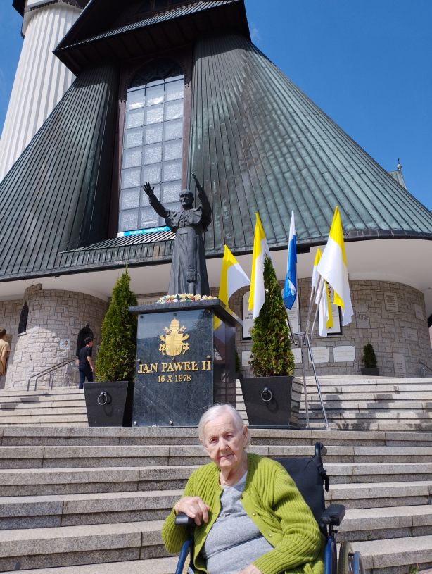 Pojechaliśmy Szlakiem Maryjnym. Najpierw na Bachledówkę (wzgórze wys. 947 mnpm)– do Sanktuarium MB Jasnogórskiej. Odwiedziliśmy Kościół i Kaplicę poznając historię tego miejsca. Po drodze kupiliśmy pamiątki i oczywiście OSCYPKI. Potem pojechaliśmy do Zakopanego na Krzeptówki do Sanktuarium MB Fatimskiej. Piękne miejsce, gdzie rozciąga się widok na Tatry, na