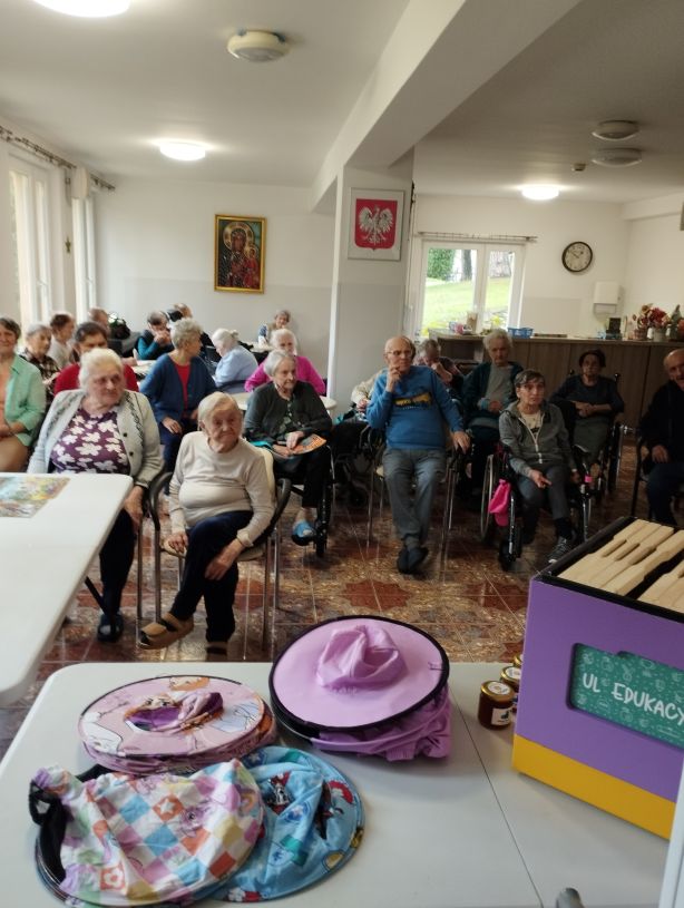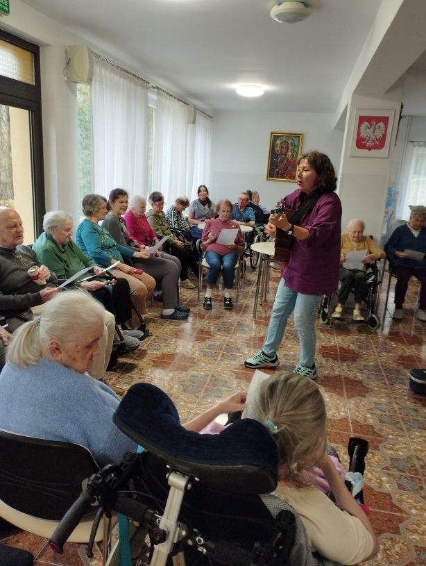 Na zdjęciu znajduje się grupa starszych osób siedzących w sali, która wygląda na świetlicę lub pokój dzienny. Wszyscy siedzą przy kilku stołach, a niektórzy z nich są na wózkach inwalidzkich. Przed nimi stoi zakonnica ubrana w niebieski habit, która unosi ręce do góry. Starsze osoby również podnoszą ręce, prawdopodobnie uczestnicząc w jakiejś formie ćwiczeń lub aktywności grupowej. W tle widoczny jest telewizor zawieszony na ścianie oraz duże okna z zasłonami wpuszczające dużo światła do pomieszczenia. Na jednym ze stołów leżą różne przedmioty, takie jak książki i zabawki edukacyjne.