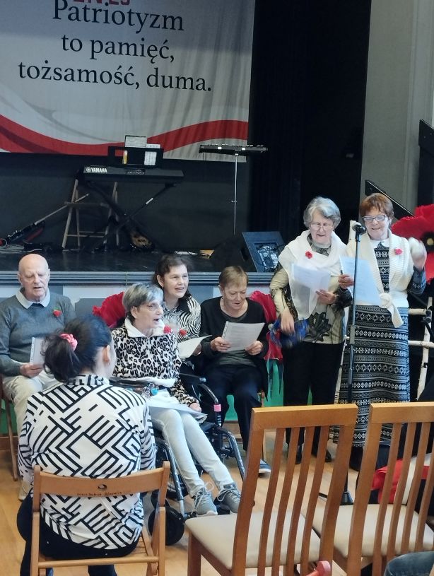 Na zdjęciu znajduje się grupa starszych osób w pokoju. Niektóre z nich siedzą na wózkach inwalidzkich, inne na krzesłach. Jedna starsza osoba stoi i wydaje się mówić do mikrofonu trzymanego przez inną osobę. Pokój ma kafelkową podłogę, a po prawej stronie zdjęcia znajduje się tablica ogłoszeń z różnymi papierami i przedmiotami przypiętymi do niej. Na ścianie wisi zegar, a w tle widać okno z zasłonami. Nad jedną z siedzących osób widoczny jest emblemat polskiej flagi.
