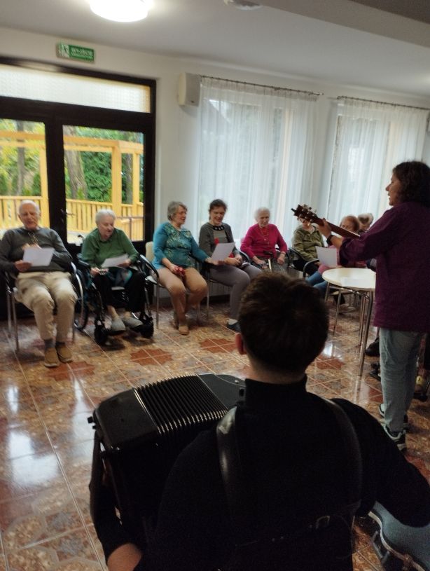 Na zdjęciu znajduje się grupa starszych osób na wózkach inwalidzkich, zgromadzona na świeżym powietrzu, prawdopodobnie w parku lub ogrodzie. Osoby te oglądają występ muzyczny. W tle widać drzewa i zieleń, co nadaje miejscu spokojny, naturalny charakter. Muzycy siedzą i grają na różnych instrumentach – widać m.in. bębny i instrumenty dęte. Cała scena ma kameralny, integracyjny klimat,