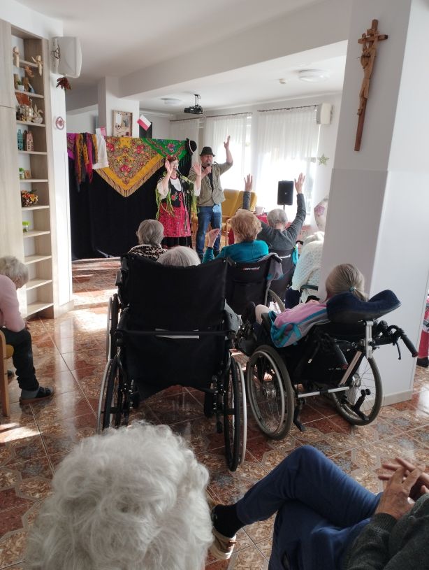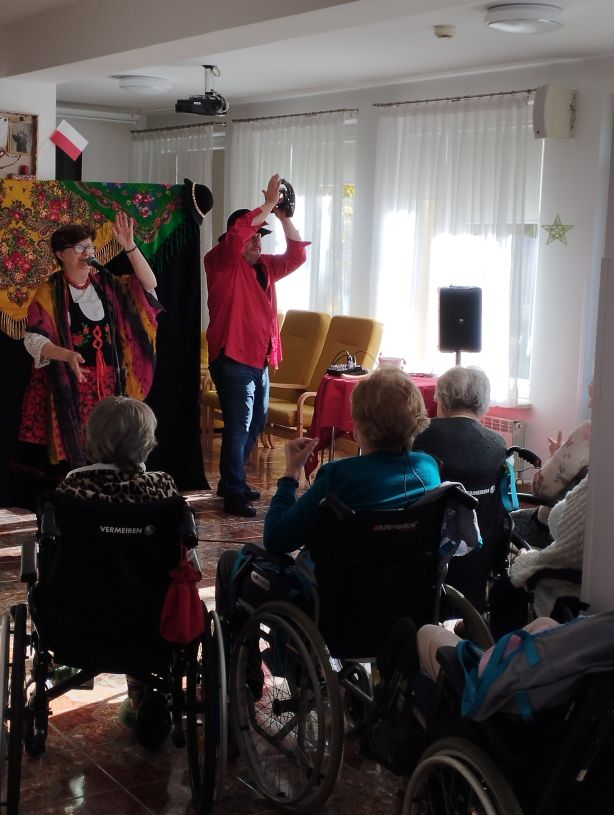 W pomieszczeniu znajduje się grupa starszych osób siedzących na krzesłach, ustawionych w półokręgu. Wszyscy są zwróceni w stronę dwóch osób przebranych w kolorowe stroje – prawdopodobnie animatorów lub artystów. Jedna z tych osób trzyma duży kawałek materiału, a druga stoi obok stołu, na którym leżą różne przedmioty. W tle widać niebieską zasłonę ozdobioną kolorowymi rysunkami oraz telewizor zawieszony na ścianie.