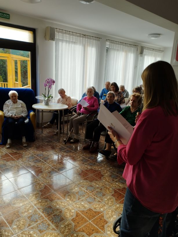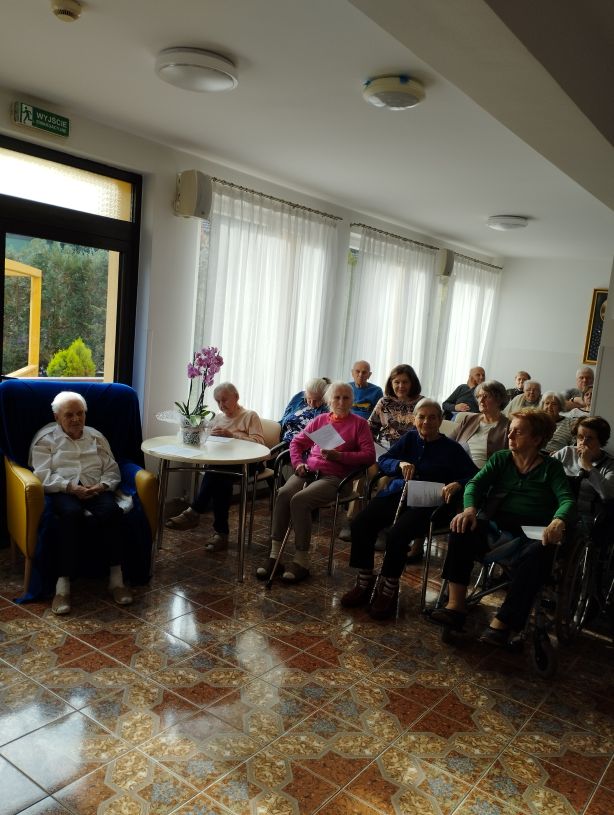 Mieszkańcy składali wierszowane życzenia Siostrze Dyrektor Agacie. Zaśpiewaliśmy oczywiście „Sto lat”. Oglądaliśmy spektakl- „Pamiątki z Krakowa” w wykonaniu aktorów. Była zabawa i tańce w kółeczku.